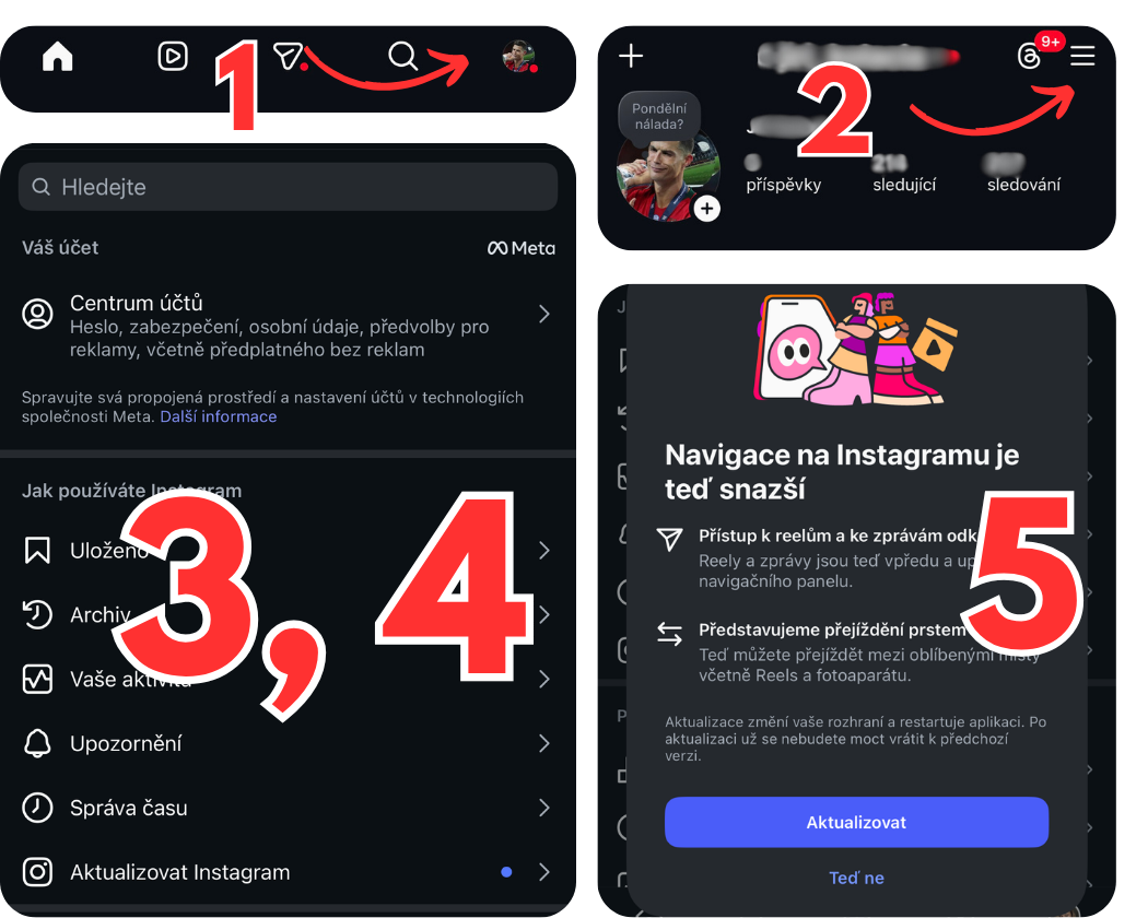 V nové verzi se právě tato lišta dočkala nejviditelnější proměny. Prostřední tlačítko s ikonou plus, které dříve sloužilo pro přidávání příspěvků nebo spuštění fotoaparátu, nahradilo tlačítko pro přímé zprávy. Tato ikona se tak přesunula z pravého horního rohu doprostřed spodní lišty, aby byla lépe dostupná. Tlačítko pro vytváření příspěvků se nově nachází v levém horním rohu hned vedle vašeho profilového jména a v pravém horním rohu zůstává pouze ikona srdce, která zobrazuje přehled aktivit a interakcí.