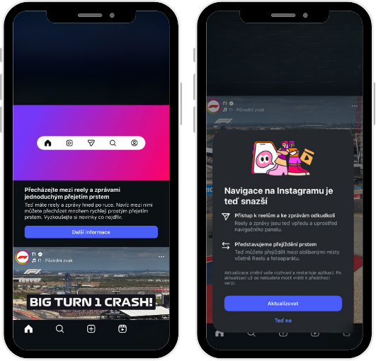 Při prvním spuštění aktualizované aplikace Instagram, která už obsahuje data k novému rozhraní, se vám na hlavní stránce Domů zobrazí banner s upozorněním. Pokud na něj klepnete, aplikace vám nejprve stručně představí hlavní změny, které aktualizace přináší, a poté nabídne možnost přepnout se do nového prostředí. Jakmile tuto volbu potvrdíte, Instagram se okamžitě „převlékne“ do nového designu.