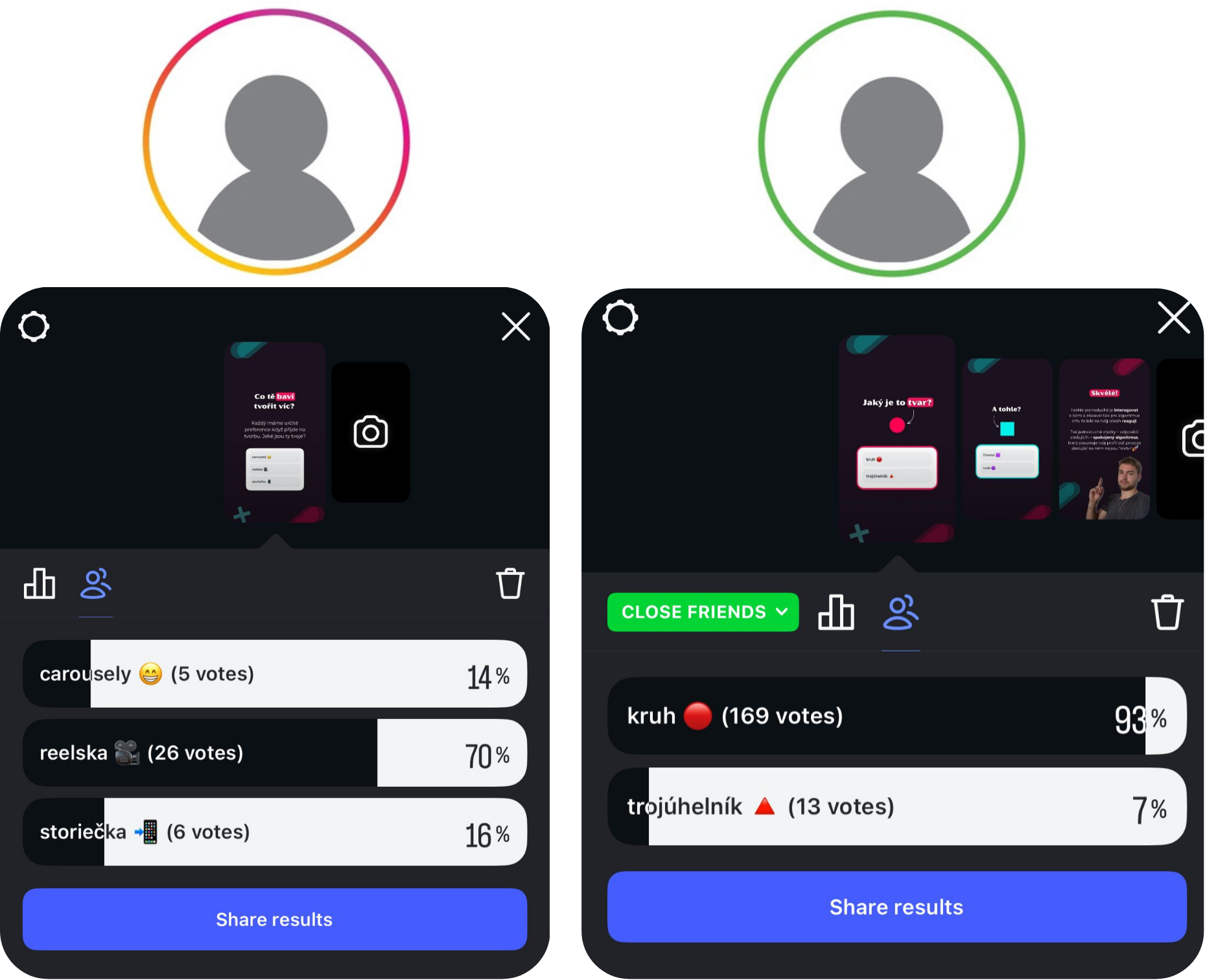 Ukázka zapojení uživatelů u klasického Stories vs. u Stories pro blízké přátele