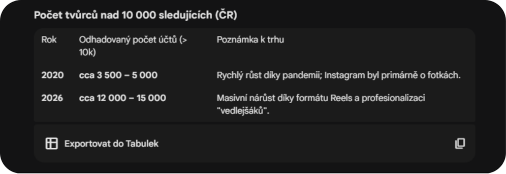 Odhad Google gemini, který odpovídal na otázku počtu tvůrců v Čr nad 10 000 sledujících
