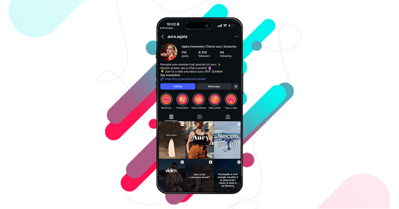Dalším z klientů, kteří si prošli mimořádně úspěšnou cestou, je instagramový profil @aura.agata. Jak už samotný název napovídá, tvůrkyně se na svém profilu věnuje tématu vnímání lidské aury a ezoterice. Instagram pro ni slouží především jako nástroj propagace osobních služeb, prostřednictvím kterých pomáhá svým klientům odhalit jejich jedinečnou auru a lépe porozumět sobě samým.