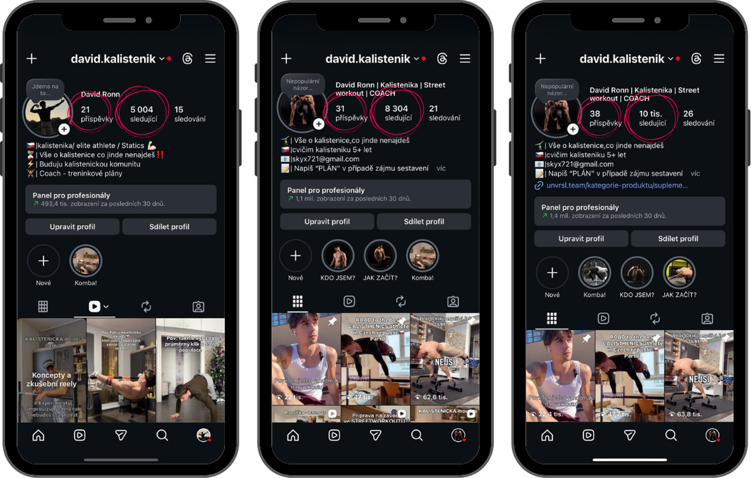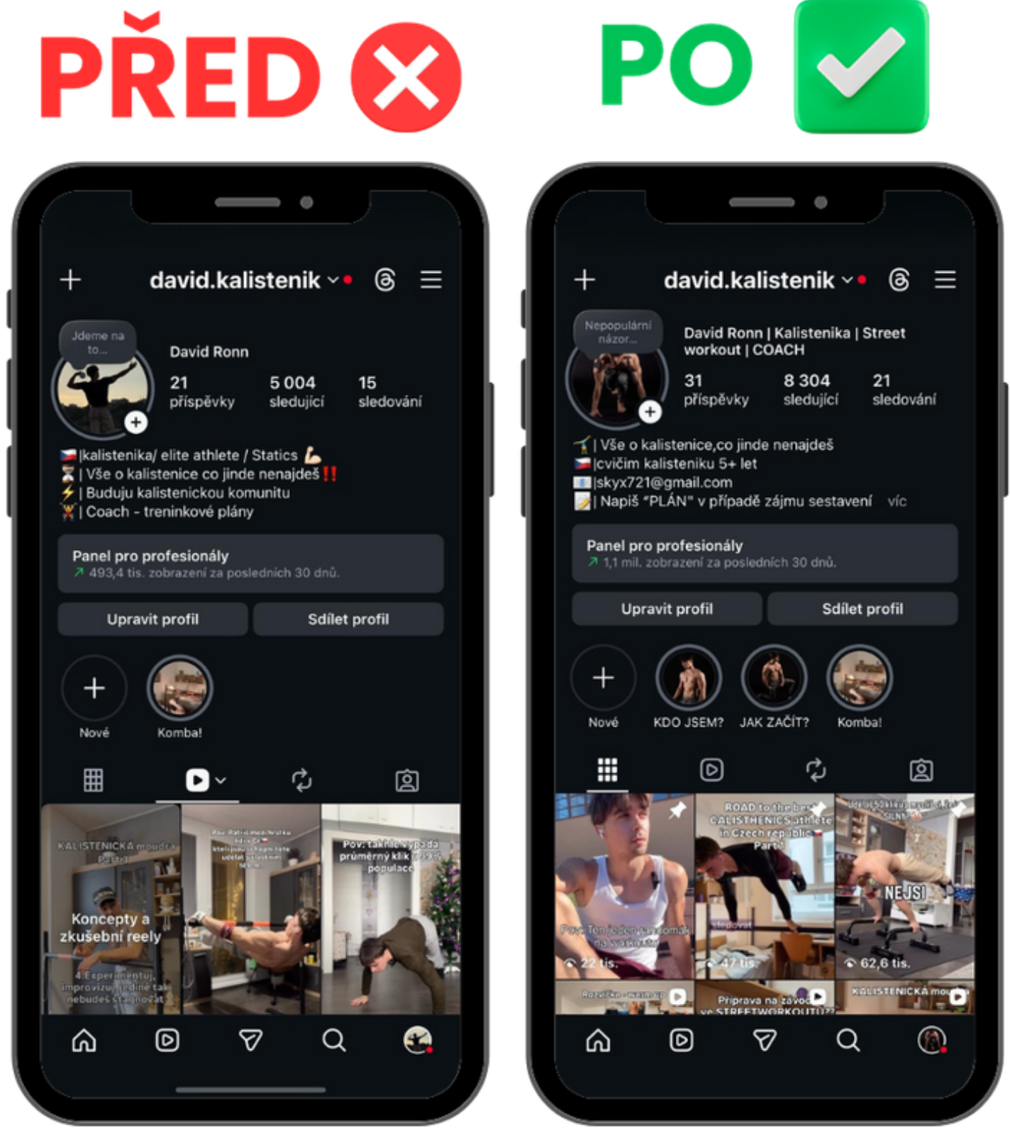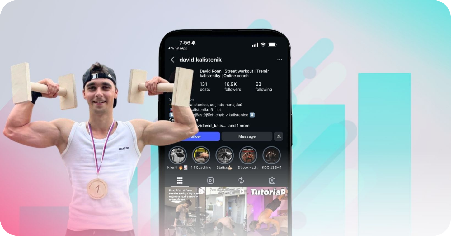 Zatímco většina tvůrců nás oslovuje až ve chvíli, kdy jejich profily dlouhodobě stagnují, David Kalistenik přišel s opačným zadáním. Měl skvělý start, během kterého dokázal nasbírat 4 000 sledujících, ale nechtěl zůstat na místě. Chtěl svůj Instagram posunout hned v samotném začátku tvorby.