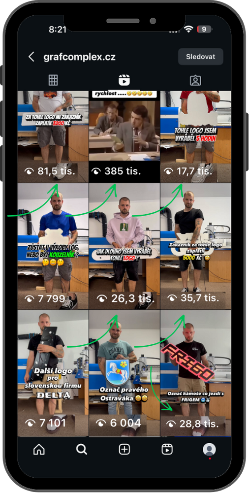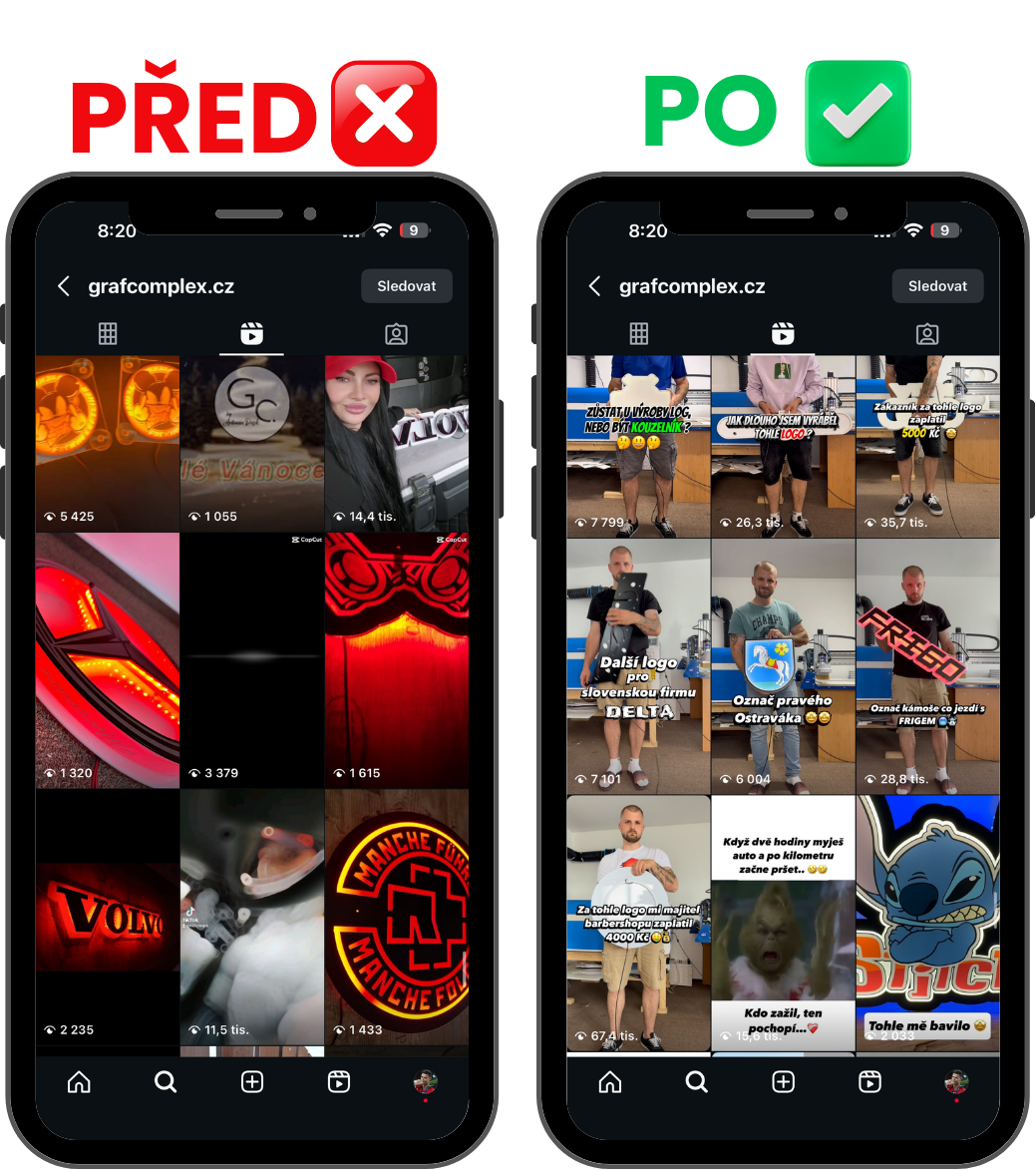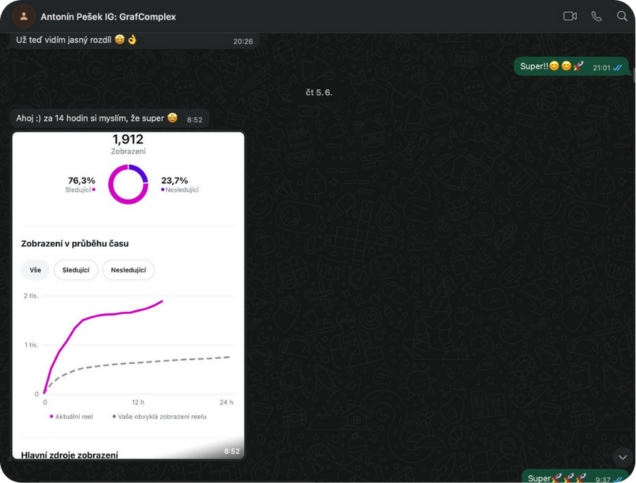 Případová studie profilu grafcomplex.cz ukazuje, že i když se tvůrce na začátku bál vystupovat před kamerou a neměl s Instagramem žádné zkušenosti, správně nastavená strategie mu pomohla překonat obavy a přetavit je v reálné výsledky. Díky měsíčnímu mentoringu, zaměření na dosahy a postupnému zapojení do obsahu získal jeho profil během krátké doby téměř milion zhlédnutí, desítky tisíc interakcí a především nové objednávky, které posunuly jeho podnikání o velký krok dál.
